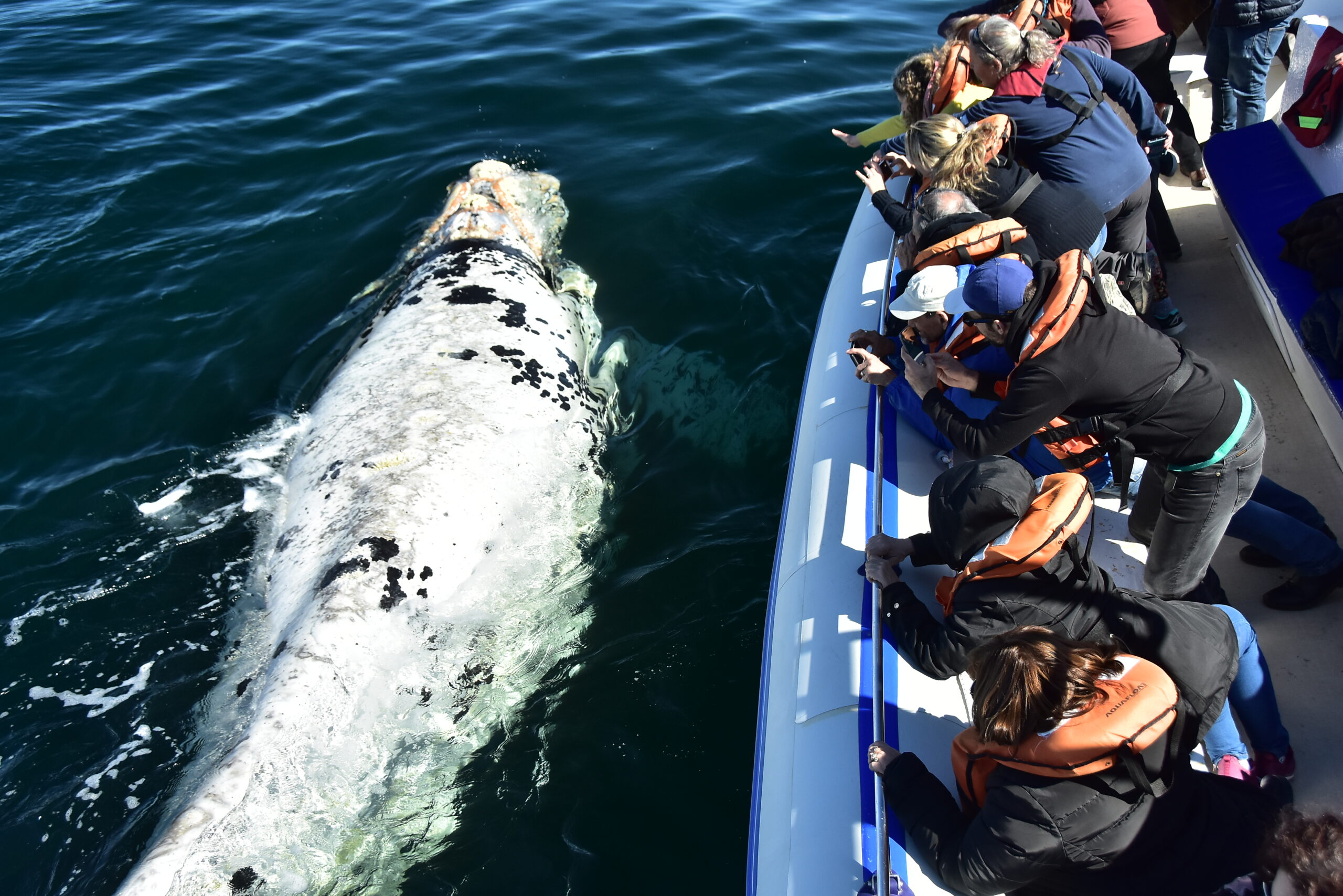 Es importante que vengas preparado con abrigo, ya que las condiciones pueden ser frescas en el mar. Desde la comodidad de nuestro barco, podrás observar a las ballenas francas en su hábitat natural, mientras realizan sus distintos comportamientos, que pueden incluir saltos, golpes de cola y más. Cada encuentro es único, ya que el comportamiento de las ballenas depende de varios factores, como el clima y la interacción con otras ballenas.